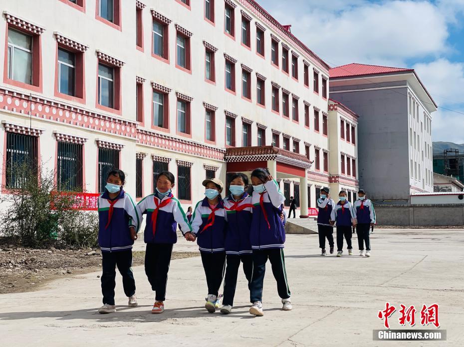 9月1日,青海省果洛藏族自治州瑪多縣地震災(zāi)后過渡安置一校區(qū)的同學(xué)們迎來了新學(xué)期。圖為學(xué)生們下課后走出教學(xué)樓。為確保青海瑪多全縣中小學(xué)(幼兒園)學(xué)生秋季正常開學(xué),該縣對災(zāi)區(qū)2933名學(xué)生、322名教職工分批次過渡安置到青海省果洛全州各校以及青海省三江源民族中學(xué)就學(xué)。 中新社記者 孫睿 攝