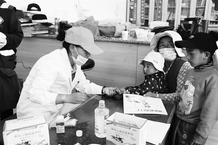 工作人員為兒童檢查身體并免費(fèi)發(fā)放“營養(yǎng)包”。圖由西藏自治區(qū)衛(wèi)健委婦幼健康處 提供