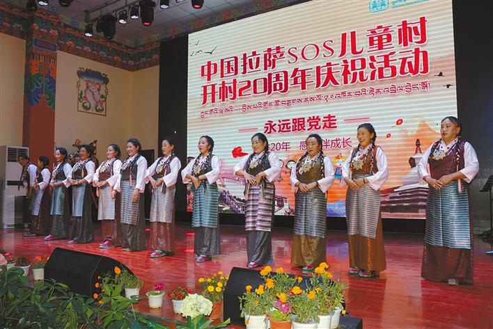 在中國(guó)拉薩SOS兒童村開村20周年慶祝活動(dòng)上,SOS村全體干部職工和孩子們共唱國(guó)歌。