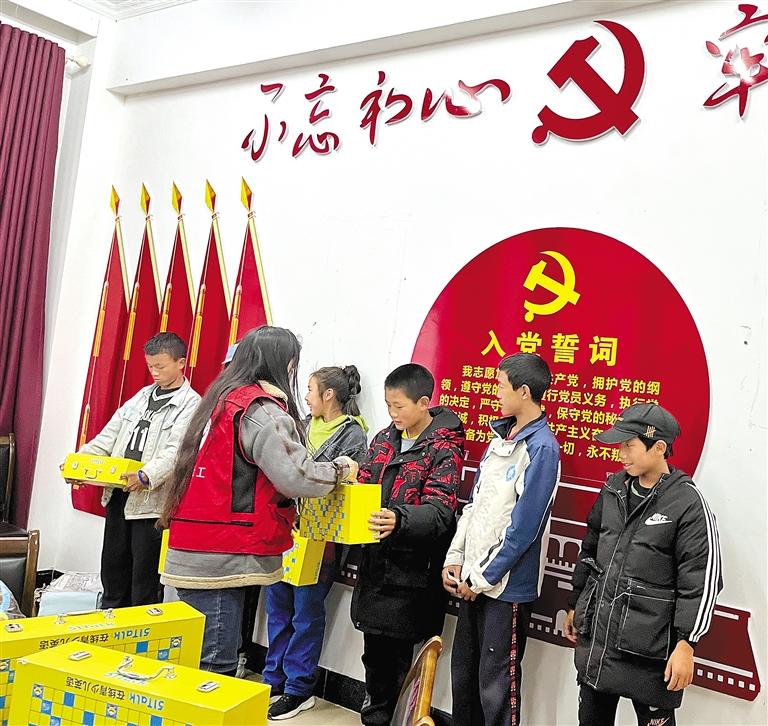 圖為工作人員向事實無人撫養(yǎng)兒童發(fā)放圖書。記者 胡文 王珊 張猛 攝