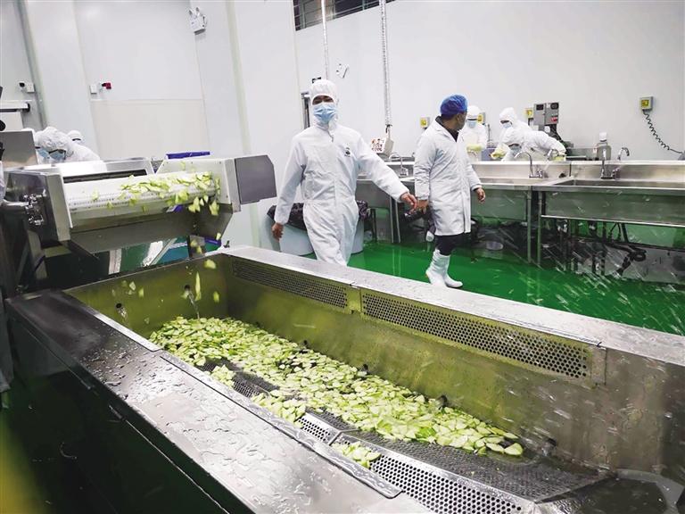 隨后,記者來到了素菜初加工車間,這里有很多設(shè)備,洗凈的一筐青筍條通過其中一個(gè)小設(shè)備后,兩分鐘全部變成了青筍丁,洗凈的菜瓜通過一條切片的生產(chǎn)線后立即變成了小的塊狀,經(jīng)過保食安專業(yè)食品凈化工業(yè)機(jī)后,直接回收到盛菜的框里。在葷菜初加工車間,工作人員把雞蛋放入水池中消毒清洗,將洗凈的雞脯肉放入切丁機(jī)中進(jìn)行分切,一兩分鐘雞脯肉就變成了肉丁。