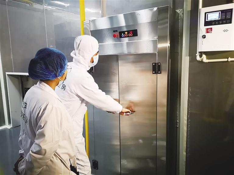 通過員工通道,在該廚房生產(chǎn)廠長(zhǎng)甘文忠的指導(dǎo)下,記者穿上了白色工作服、戴上食品安全帽,換上高筒膠鞋,洗手消毒、測(cè)量體溫、隨身攜帶的手機(jī)、首飾全部摘掉后,通過腳踏池進(jìn)入生產(chǎn)加工車間。