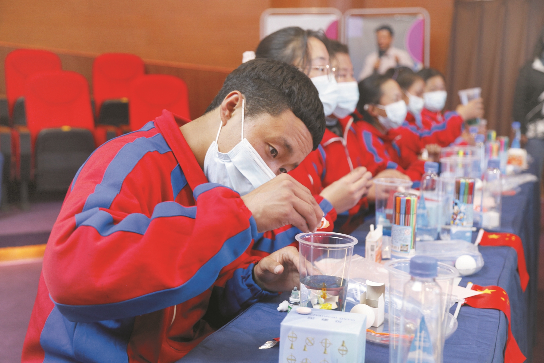 圖為學(xué)生跟隨航天員在同步做實(shí)驗(yàn)。拉薩融媒記者 索 曲攝