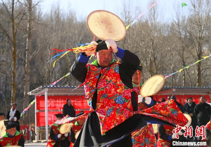 “我們會(huì)在每年春天播種前后,舉行廟會(huì)。會(huì)上由法師打著單面扇形羊皮鼓跳舞,祈求禳災(zāi)避禍,平安吉祥。由于敲鼓時(shí)發(fā)出了‘梆、梆’聲響就稱它為梆梆會(huì)?!卑鸢鹞璺沁z傳承人李占森介紹,梆梆會(huì)是土族民俗祭祀文化保留最為完整的活動(dòng)。