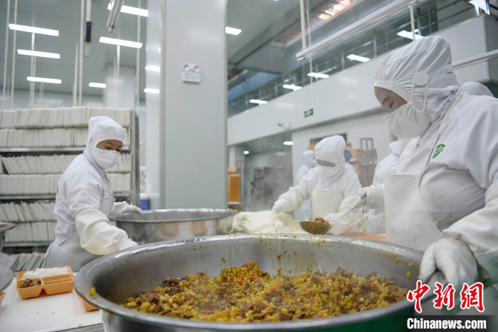 圖為3月11日,西藏自治區(qū)拉薩市城關(guān)區(qū)凈土拉薩中央廚房配餐車間內(nèi),工作人員正在為學(xué)生集中配餐。 中新社記者 貢嘎來(lái)松 攝