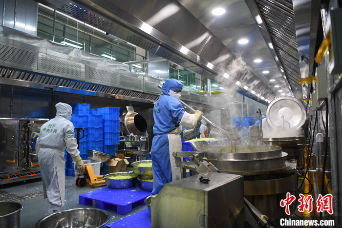圖為3月11日,西藏自治區(qū)拉薩市城關(guān)區(qū)凈土拉薩中央廚房?jī)?nèi),廚師們?cè)谂腼儗W(xué)生營(yíng)養(yǎng)午餐。 中新社記者 貢嘎來(lái)松 攝