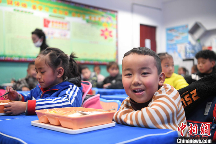 圖為3月11日,西藏自治區(qū)拉薩市城關(guān)區(qū)第三小學(xué)的學(xué)生食用營(yíng)養(yǎng)午餐。 中新社記者 貢嘎來(lái)松 攝