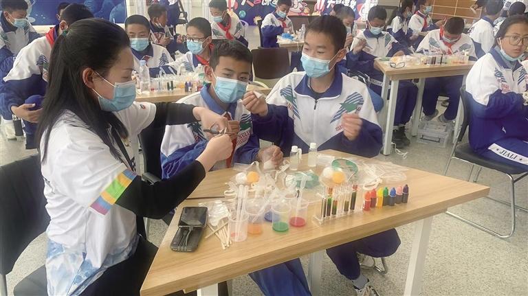 西藏自然科學(xué)博物館科普輔導(dǎo)員指導(dǎo)參與學(xué)生同步體驗(yàn)“天宮課堂”科學(xué)實(shí)驗(yàn)包操作。記者 王靜 攝