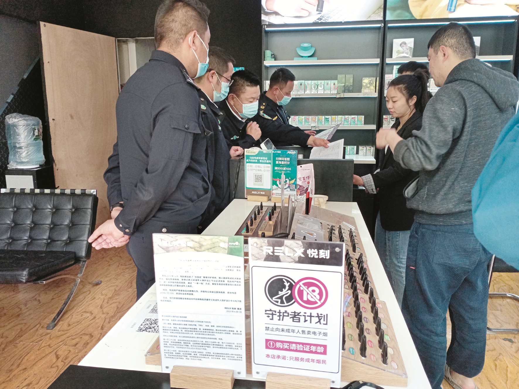 4月25日上午,市公安局和市煙草專賣局等四部門工作人員在柳梧新區(qū)聯(lián)合開展了電子煙銷售網(wǎng)點檢查。每到一個電子煙銷售網(wǎng)點,執(zhí)法人員會詳細查看銷售網(wǎng)點是否具有相關(guān)經(jīng)營資質(zhì)、是否設立不得向未成年人售賣電子煙警示標志以及身份證件核驗等規(guī)定落實情況,并向電子煙經(jīng)營者進行相關(guān)法律法規(guī)宣傳,告知經(jīng)營者嚴禁向未成年人銷售電子煙。