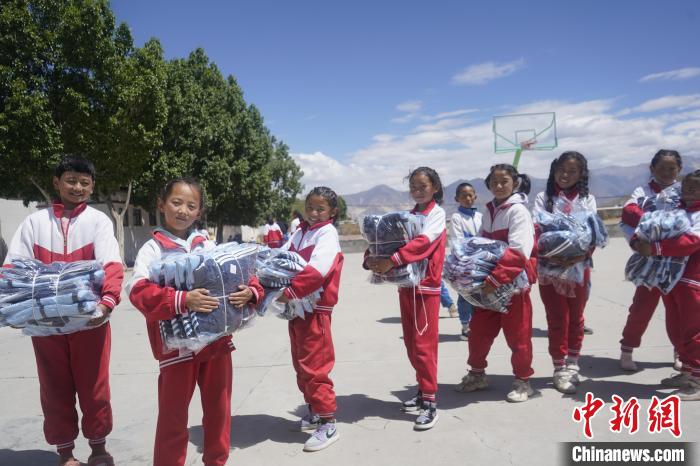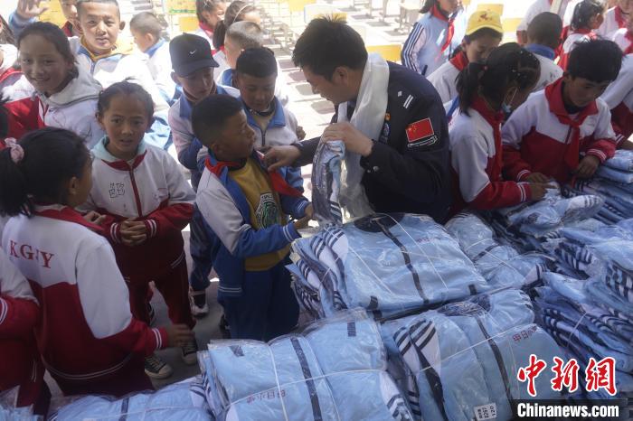 圖為拉薩出入境邊防檢查站的民警為學(xué)生發(fā)放校服?!∝暩聛硭?攝