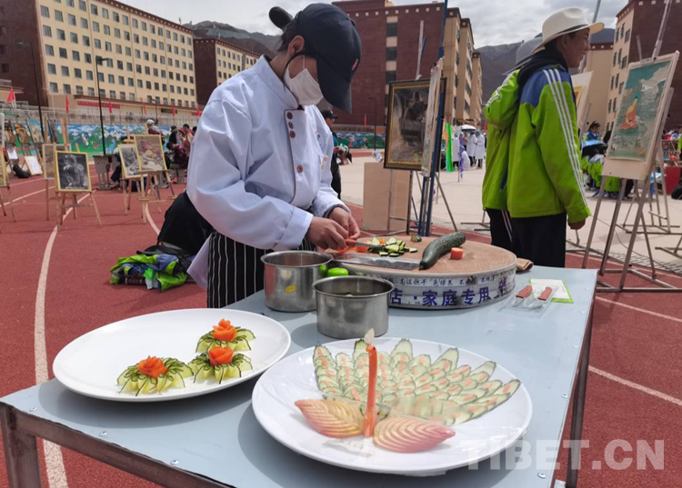 圖為來(lái)自察雅縣的加永卓瑪同學(xué)展示自己冷拼作品“孔雀開(kāi)屏”