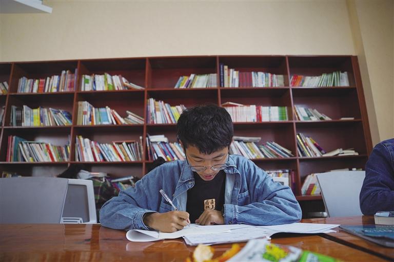 除了教室,閱覽室也是學(xué)習(xí)的好地方。在閱覽室,不少同學(xué)正奮筆疾書,只聽(tīng)得見(jiàn)書頁(yè)翻動(dòng)和筆尖書寫的“沙沙”聲。陽(yáng)光透過(guò)玻璃傾瀉在書桌上,暖暖地照在這些青春的面龐,把他們點(diǎn)綴成五月里最美的風(fēng)景。閱覽室的最里邊,一位老師正在認(rèn)真講解試卷上的難題,不一會(huì)兒同學(xué)們就露出了恍然大悟的表情?!拔液芟矚g來(lái)閱覽室學(xué)習(xí),這兒比教室更安靜些,可以讓我靜下心來(lái)做題?!睂W(xué)生扎西江村說(shuō)。