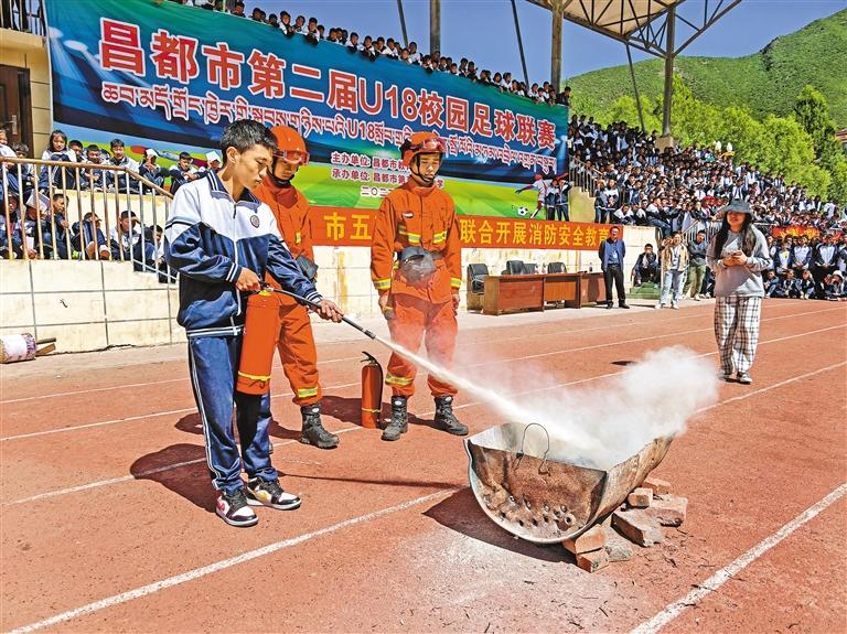 圖為在消防員的指導(dǎo)下,學(xué)生體驗滅火。記者 桑鄧旺姆 通訊員 鄧珠平措 攝