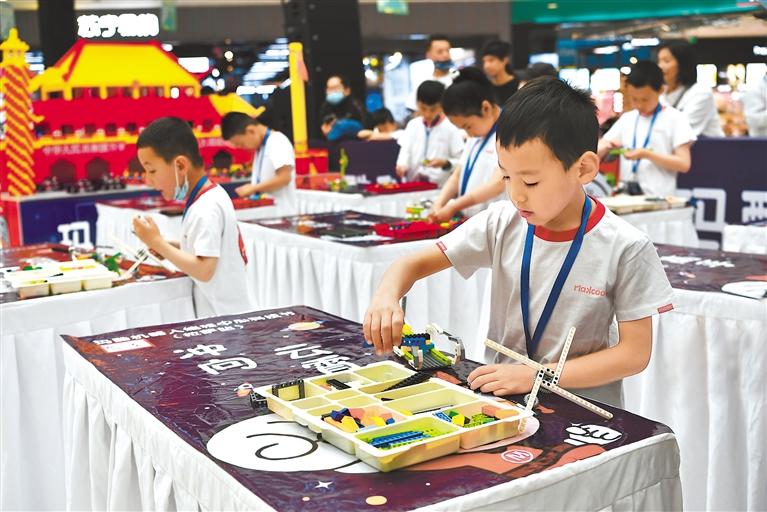 圖為孩子們?cè)谕瓿煞e木挑戰(zhàn)項(xiàng)目。記者 王敏 攝