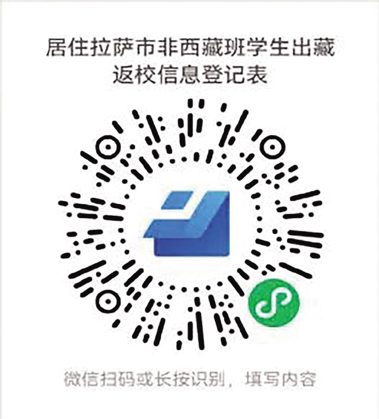 根據(jù)拉薩市委、市政府和自治區(qū)教育廳部署安排,為準(zhǔn)確掌握學(xué)生出藏行程規(guī)劃,為民航、鐵路等交通部門調(diào)配運(yùn)力提供參考依據(jù),拉薩市教育局需精準(zhǔn)掌握居住在拉薩市的區(qū)外就讀西藏籍大學(xué)生、區(qū)外非西藏班就讀西藏干部職工子女、區(qū)外就讀進(jìn)城務(wù)工人員子女、旅居區(qū)內(nèi)的區(qū)外學(xué)生出藏相關(guān)信息,請廣大家長、學(xué)生積極配合,掃描以下二維碼,填報出行信息;下載健康監(jiān)測檔案,于出藏7天前填寫健康監(jiān)測。