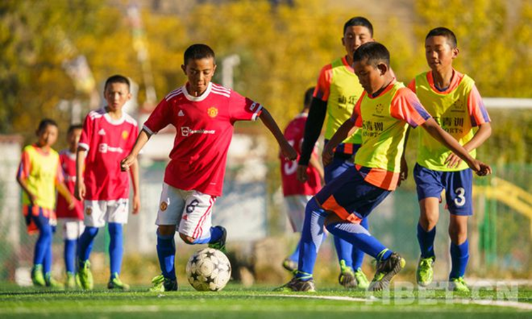 圖為2021年全國青少年體育冬夏令營進校園活動(西藏站)閉營儀式上,學生們正在進行足球比賽 攝影:趙耀