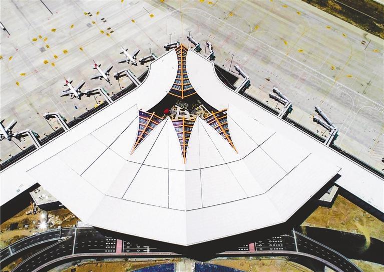 基礎(chǔ)設(shè)施更加完善,西藏民航航線擴展到152條,通航城市發(fā)展到68個,進出港航班日均219架次,2021年旅客吞吐量達603萬余人次。圖為西藏自治區(qū)拉薩市貢嘎國際機場T3航站樓一角。