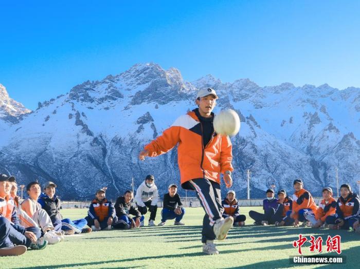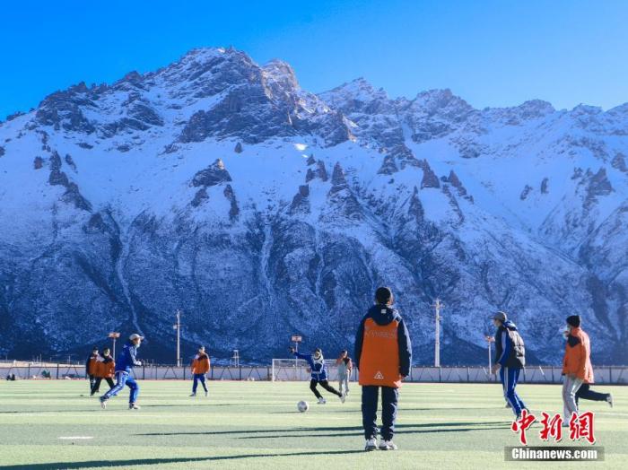 圖為11月25日,西藏那曲市嘉黎縣中學(xué)學(xué)生們在“雪山下的夢幻足球場”上進行足球訓(xùn)練。 中新社記者 貢嘎來松 攝