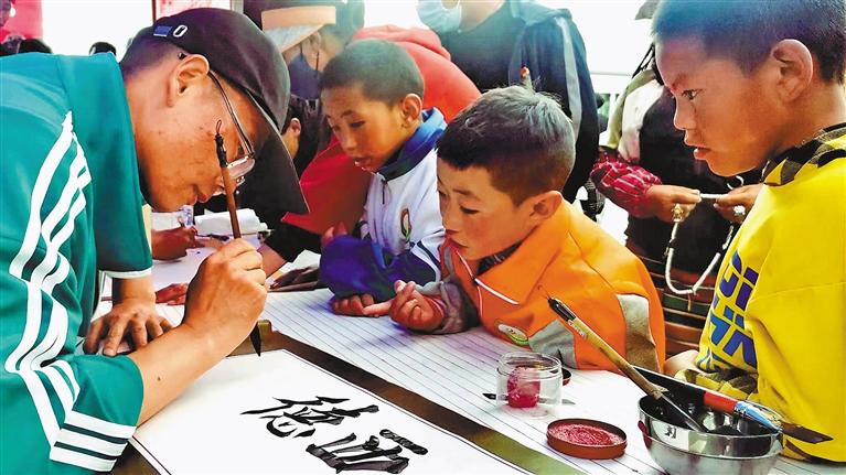 圖為阿里地區(qū)書畫家進(jìn)社區(qū)活動現(xiàn)場,為群眾書寫扎西德勒。通訊員 唐磊 攝