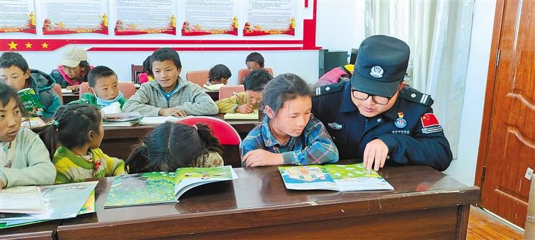 日喀則市曲龍貢達(dá)村駐村工作隊(duì)(西藏邊檢總站派駐)開(kāi)設(shè)小課堂,為中小學(xué)生免費(fèi)提供制作手工、課外讀物講解等服務(wù)。圖為駐村隊(duì)員劉海鵬為學(xué)生講解課外讀物。記者 盧文靜 攝