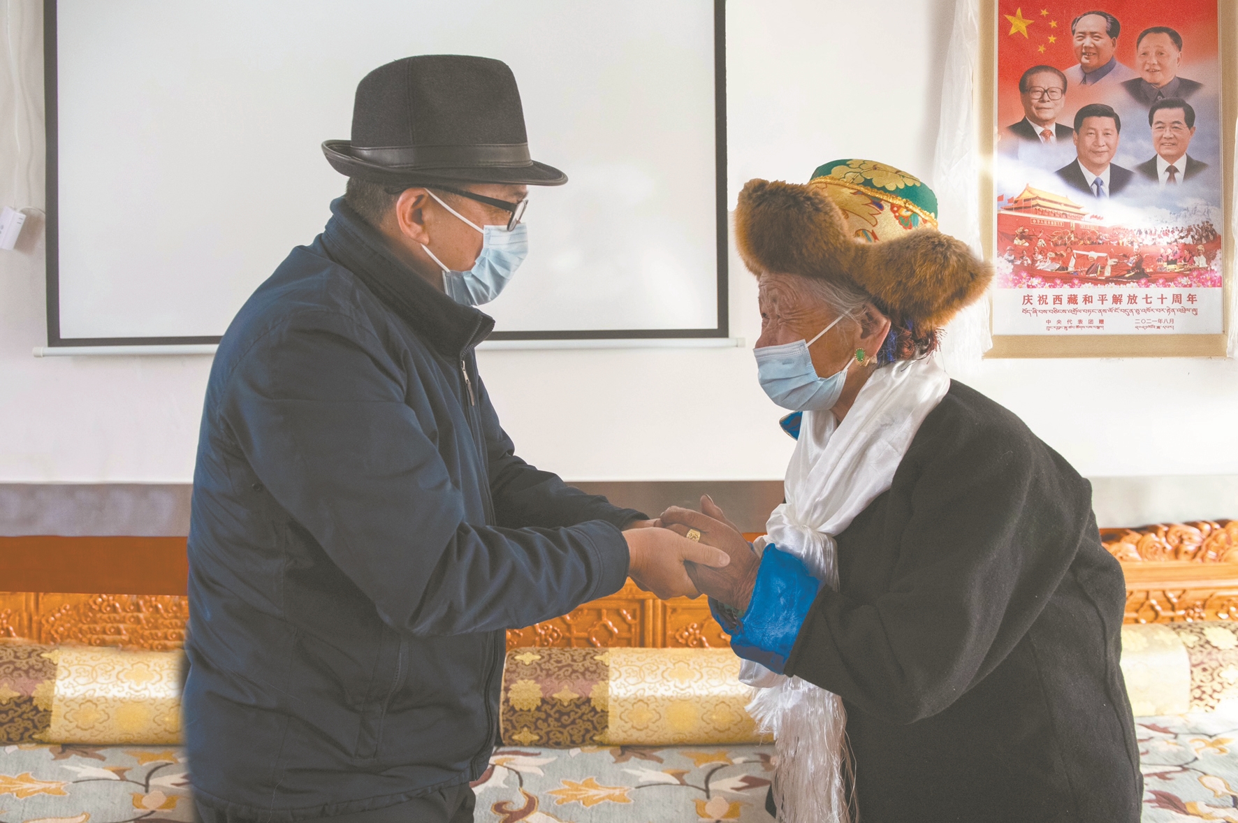圖為市委副書記、市長王強為城關區(qū)特困人員集中供養(yǎng)中心的老人敬獻哈達,致以節(jié)日美好祝福。拉薩融媒記者 玉珠多杰攝