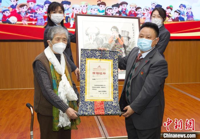 圖為活動當(dāng)天知名畫家吳茜向中國藏學(xué)研究中心西藏文化博物館捐贈西藏主題作品。 中國藏學(xué)研究中心供圖