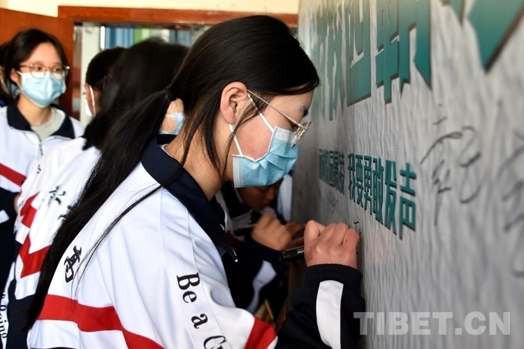 圖為學(xué)生們依次在面對校園霸凌我要勇敢發(fā)聲簽名墻進行簽名 攝影:次旦拉姆
