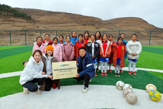 3月3日,在瓦吾小學的“玫瑰夢想球場”上,四川籍的中國女足國腳萬佳瑤(前左)、螞蟻公益基金會秘書長王曉晶(前中)為瓦吾小學頒發(fā)“追風計劃”入選學校牌匾。新華社記者沈伯韓攝