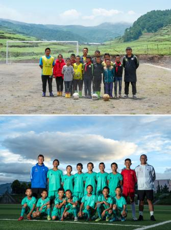 上圖:2019年5月29日,在瓦吾小學的泥地足球場上,該校足球隊創(chuàng)建人曲比史古(左一)、來自長春的支教老師崔洪明(右一)和足球隊球員合影。下圖:2020年8月13日,在四川省昭覺縣拉莫足球場,歐足聯(lián)A級教練哈維爾(后排左一)、搭檔殷建淋(后排右一)與昭覺皇家馬德里足球隊球員合影,該球隊有7名來自瓦吾小學的孩子。新華社記者沈伯韓攝