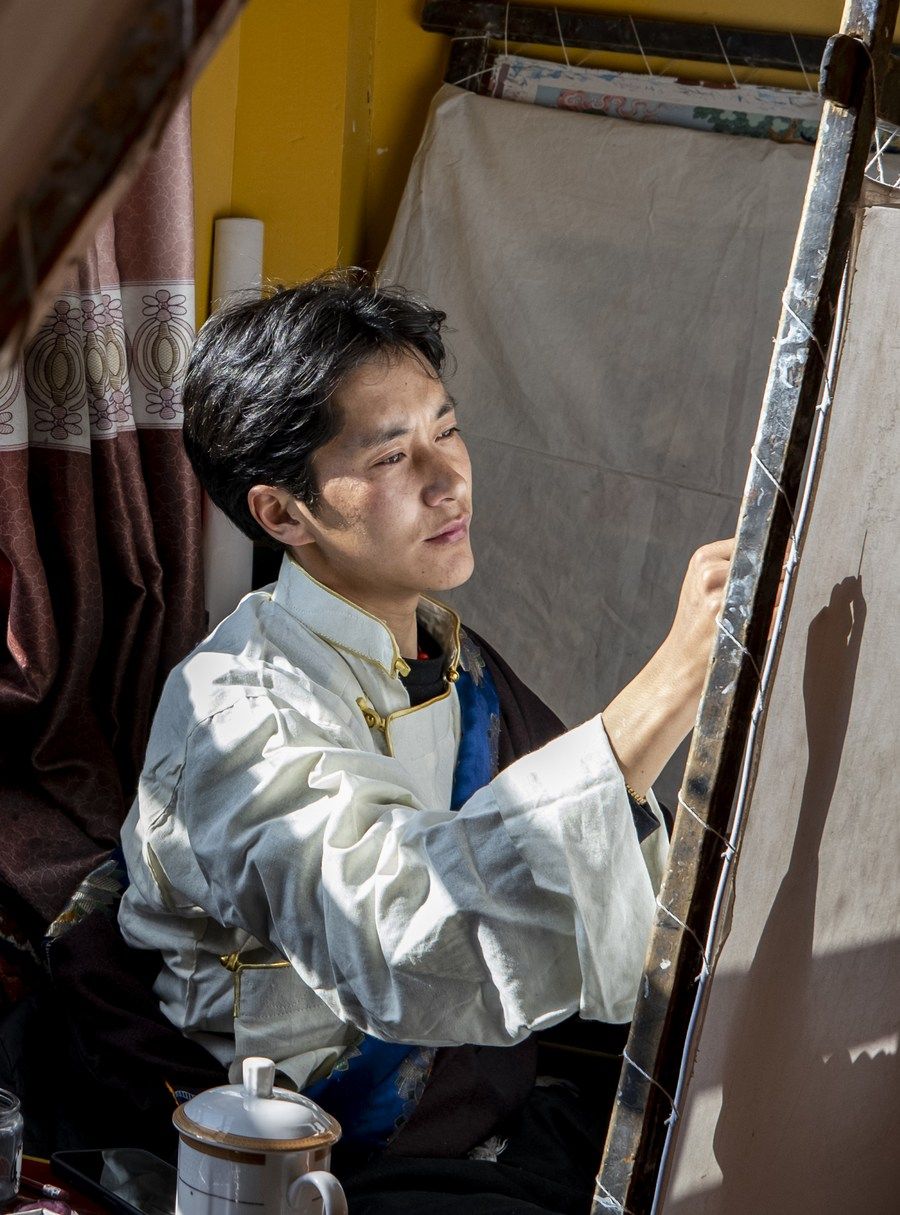 唐卡繪制考驗(yàn)畫(huà)師的定力,坐姿不能隨意,必須端正地盤(pán)膝而坐。又因?yàn)楫?huà)筆細(xì)小,落筆和著色都依賴(lài)畫(huà)師手法的穩(wěn)健。