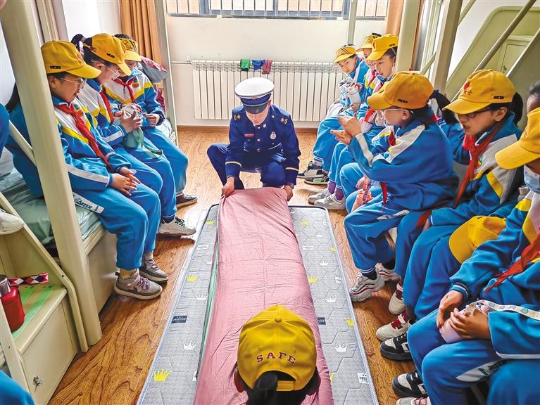 拉薩市森林消防大隊(duì)隊(duì)員在為學(xué)生講解如何使用滅火器。記者 格桑倫珠 盧文靜 攝