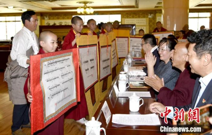 2022年7月,西藏佛學(xué)院9名少年活佛完成小學(xué)階段學(xué)習(xí),在拉薩順利畢業(yè)。圖為少年活佛們?cè)诋厴I(yè)典禮教育成果展上展示藏漢書法作品。李林 攝
