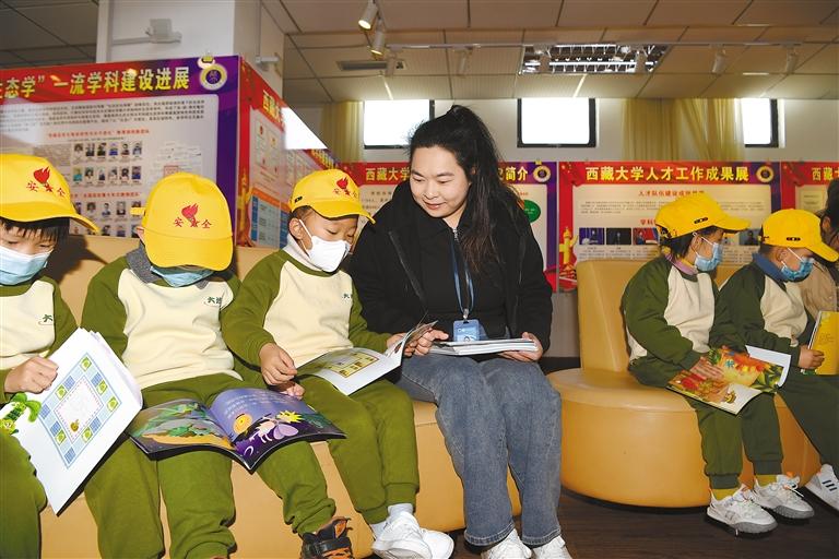 圖為西藏大學(xué)圖書館的老師與孩子們?cè)谝黄痖喿x繪本。記者 李洲 攝