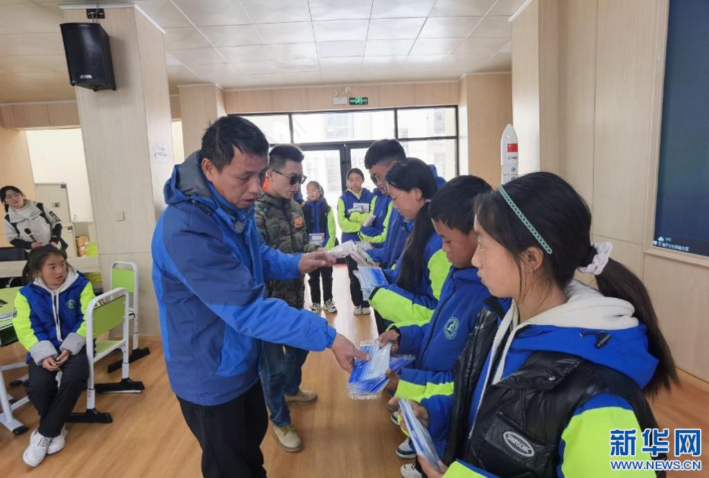 福建省第十批援藏工作隊(duì)教育組教師代表正在為學(xué)生們發(fā)放書籍和口罩。