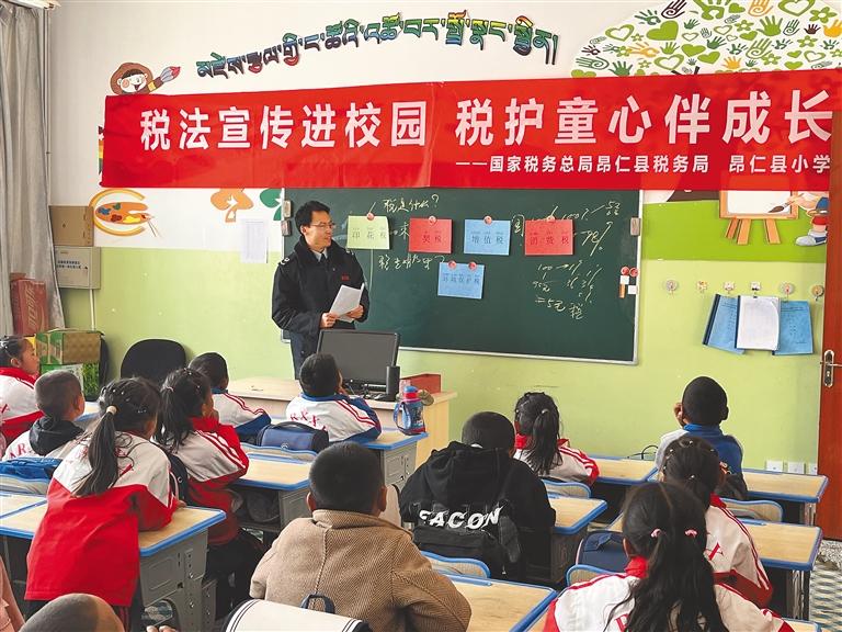 圖為國家稅務(wù)總局昂仁縣稅務(wù)局稅宣小隊(duì)的稅務(wù)干部為學(xué)生講解稅法知識。記者 楊小娟 攝