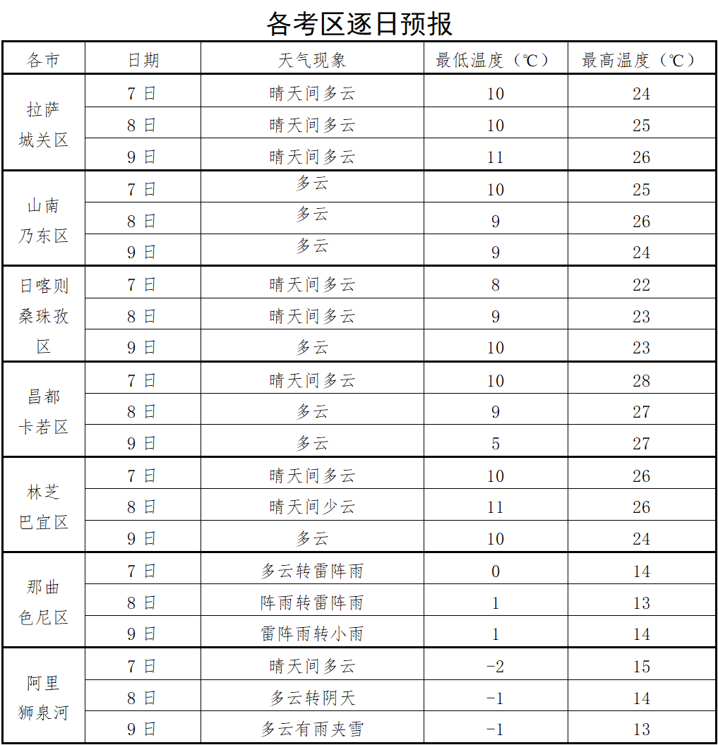 2.那曲和阿里部分時段有陣性降水,雨天路滑,考生適當提早出行,備好雨具。