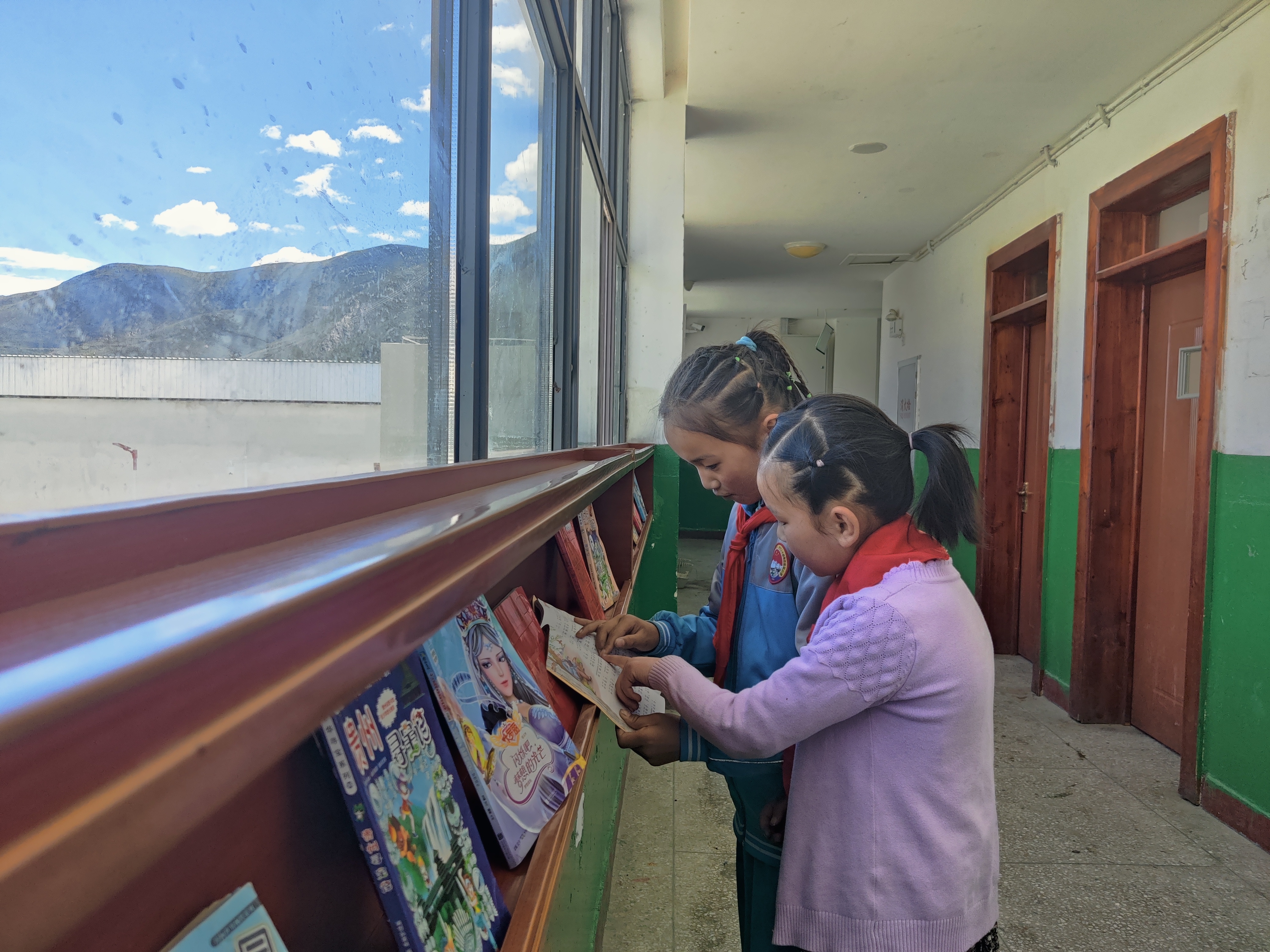圖為買玉軒(右一)和同學在讀書廊看課外書。拉薩融媒記者 余洋洋攝