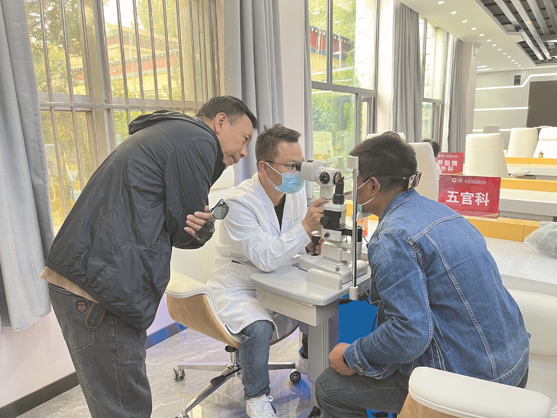 圖為西藏大學(xué)附屬阜康醫(yī)院的醫(yī)生為職工檢查眼睛。 拉薩融媒記者 大索朗曲珍攝
