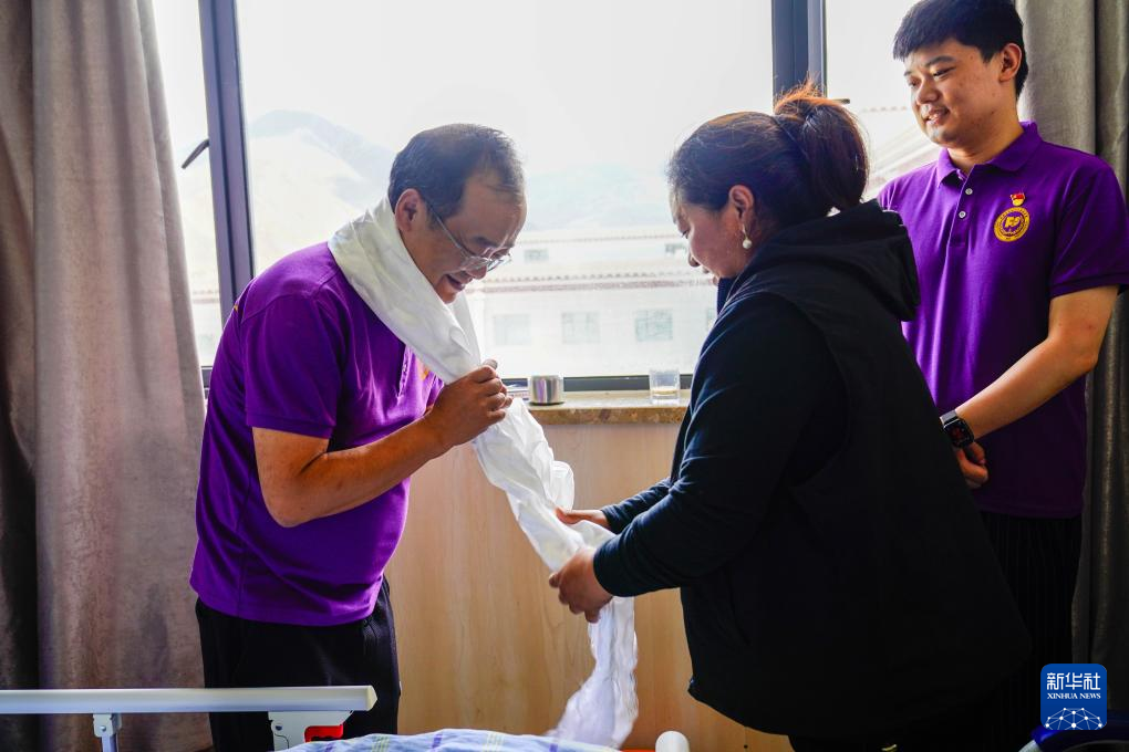 患者母親尼珍向醫(yī)護人員敬獻哈達以表感謝。 新華社記者 劉洪明 攝