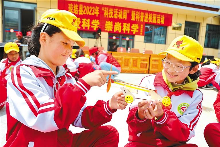 圖為瓊結(jié)縣拉玉鄉(xiāng)小學學生在對拼裝完成的橡皮筋動力車進行實驗。(資料圖片)記者 白瑪澤旺 通訊員 倫珠澤仁 攝