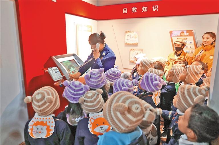 在消防宣傳員引領(lǐng)下,小朋友體驗“119”模擬報警。