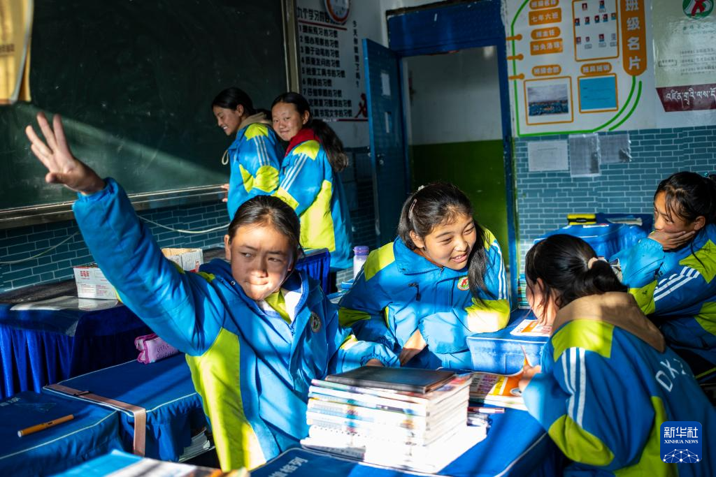 斯曲卓瑪(右三)和同學在課間休息(11月10日攝)。新華社記者 孫非 攝