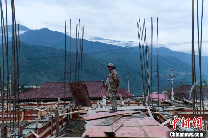 12月18日傍晚,墨脫縣門巴族村民新生在新建房屋地基上查看進(jìn)度。 中新社記者 江飛波 攝