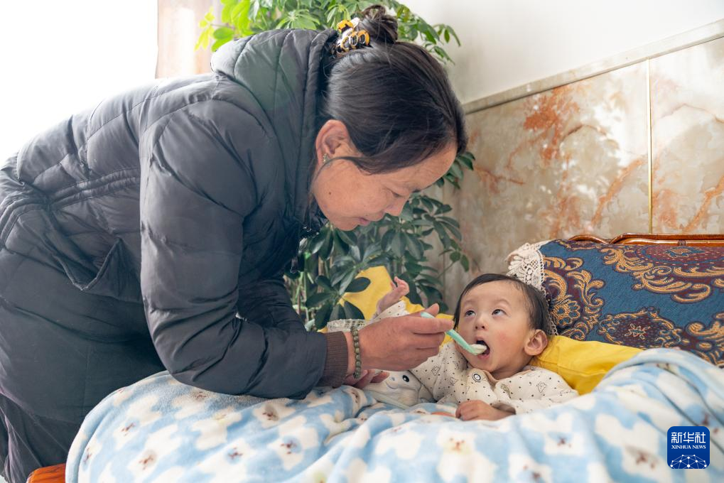 1月8日,巴桑在給一歲半的拉巴扎西喂飯。新華社發(fā)(丁增尼達攝)