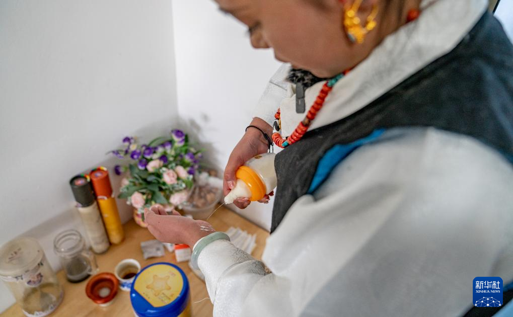 1月8日,旦增卓瑪給孩子沖奶粉時試溫。新華社發(fā)(丁增尼達攝)