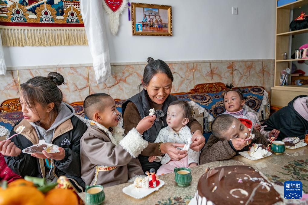 1月8日,巴桑和孩子們一起吃蛋糕。新華社發(fā)(丁增尼達攝)