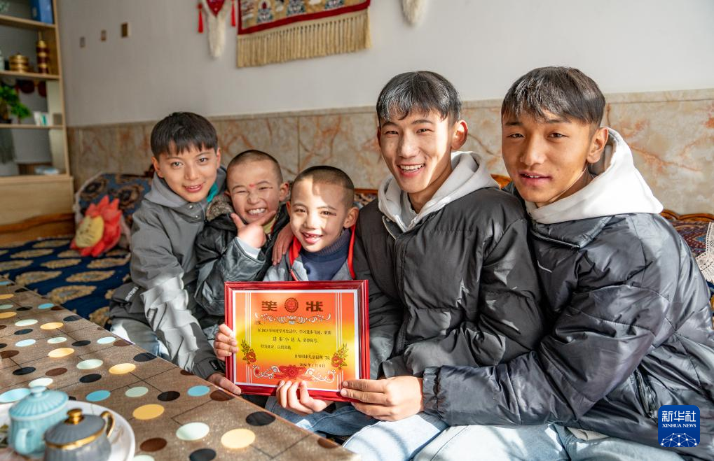 1月8日,“幸福家庭”的孩子們展示獎狀。新華社發(fā)(丁增尼達攝)