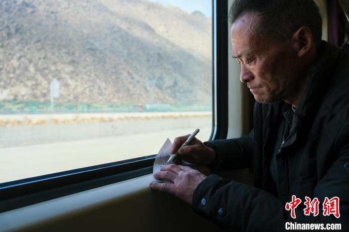 2月1日,Z166次列車上,返鄉(xiāng)的魏恩銀在填寫“旅客健康登記卡”,這是高海拔青藏鐵路上旅客獨(dú)有的健康登記措施?!≈行律缬浾?江飛波 攝