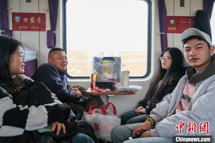 2月1日,Z166次列車硬座車廂,幾位首次到西藏旅行的大學(xué)生體驗(yàn)青藏鐵路。中新社記者 江飛波 攝