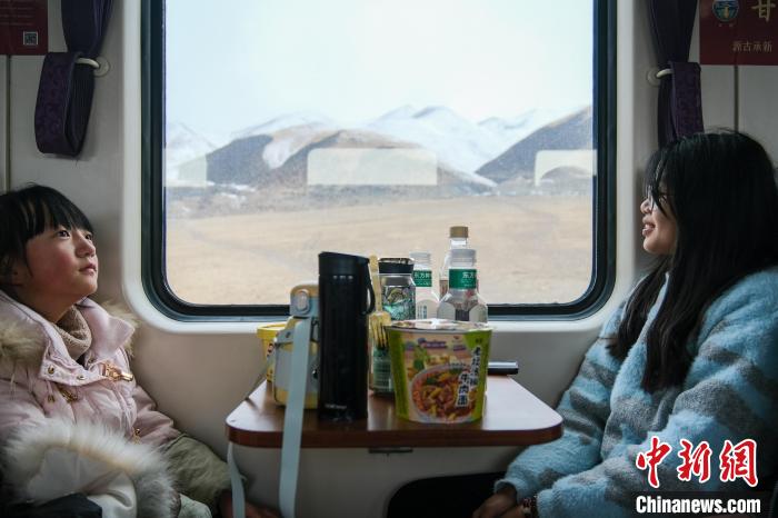 2月1日,Z166次列車上,來自廣東廣州的大學(xué)生周子茹(右)欣賞青藏鐵路沿線高原風(fēng)光?!≈行律缬浾?江飛波 攝